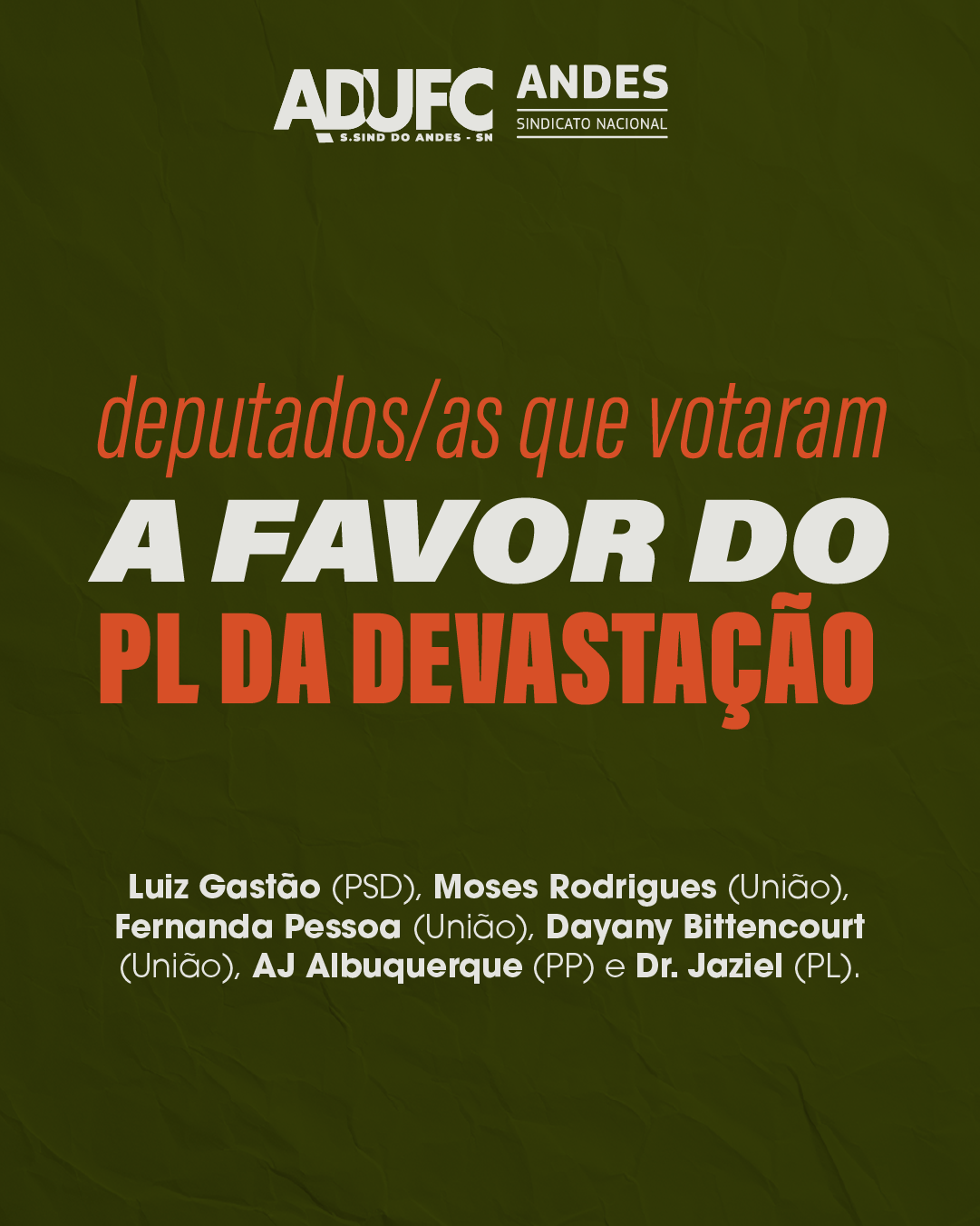 No Ceará, os/as deputados/as que votaram favoráveis ao PL da Devastação são: Luiz Gastão (PSD), Moses Rodrigues (União), Fernanda Pessoa (União), Dayany Bittencourt (União), AJ Albuquerque (PP) e Dr. Jaziel (PL).