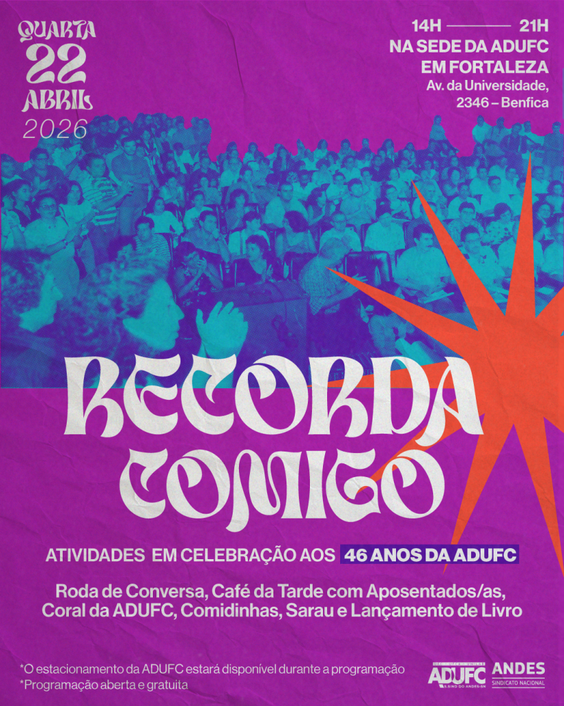 A ADUFC comemora seus 46 anos com uma série de atividades entre os dias 22 e 24 de abril na sede em Fortaleza. Com uma trajetória marcada por luta, organização coletiva e conquistas em defesa da educação pública e pela garantia de direitos para a categoria docente, o sindicato faz um convite direto para celebrar seu aniversário em 2026: estar junto. As atividades reúnem memória, formação e celebração na sede da Seção Sindical em Fortaleza.