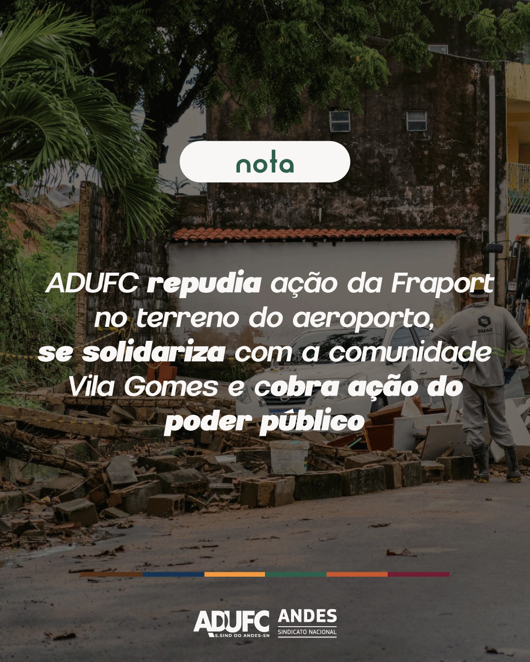 A Diretoria da ADUFC se solidariza com a comunidade Vila Gomes, repudia as ações da Fraport e exige que o poder público cumpra o seu papel, revendo as licenças de funcionamento e incentivos fiscais para uma empresa que está prejudicando diretamente o povo cearense.