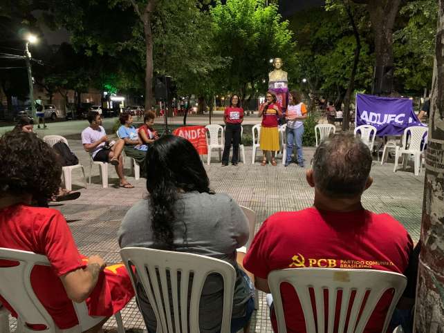 O encontro ocorreu na Praça da Gentilândia, com representantes de entidades sindicais e coletivos de juventude (Fotos: Lorena Alves/ADUFC)